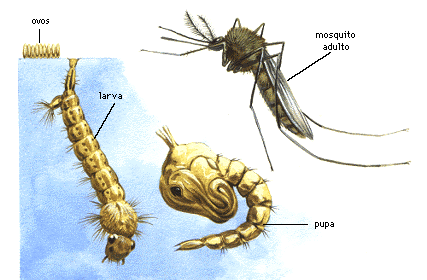 Larvas – Após a eclosão dos ovos surgem as larvas, fase de alimentação e crescimento, alimentam-se da matéria orgânica presente na água. Essa etapa dura de 3 a 7 dias.