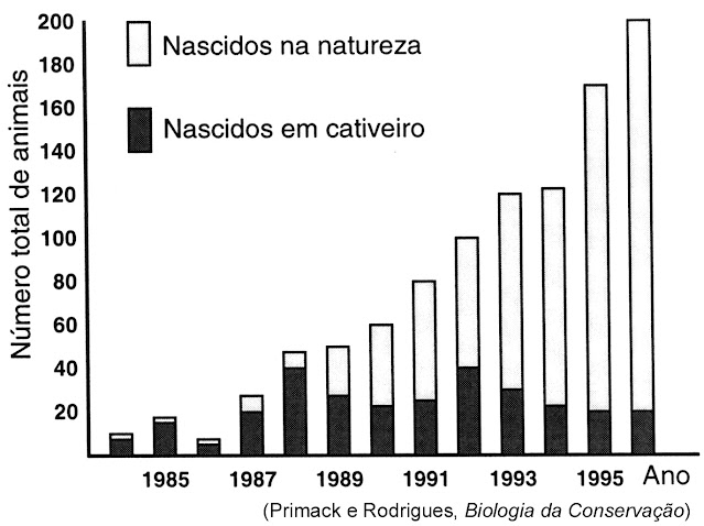 (A) à adaptação dos animais nascidos em cativeiro ao ambiente natural, mostrada pelo aumento do número de nascidos na natureza.