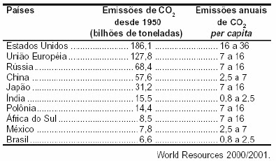 8 – (ENEM 2002) O Protocolo de Kyoto uma convenção das Nações Unidas que é marco sobre mudanças climáticas, estabelece que os países mais industrializados devem reduzir até 2012 a emissão dos gases causadores do efeito estufa em pelo menos 5% em relação aos níveis de 1990. Essa meta estabelece valores superiores ao exigido para países em desenvolvimento. Até 2001, mais de 120 países, incluindo nações industrializadas da Europa e da Ásia, já haviam ratificado o protocolo. No entanto, nos EUA, o presidente George W. Bush anunciou que o país não ratificaria Kyoto, com os argumentos de que os custos prejudicariam a economia americana e que o acordo era pouco rigoroso com os países em desenvolvimento.
