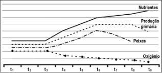 (A) Entre t3 e t6, a competição pelo oxigênio leva à multiplicação de peixes, bactérias e outros produtores.