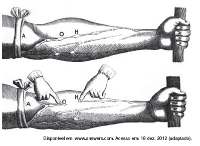 3 – (ENEM 2013) A imagem representa uma ilustração retirada do livro De Motu Cordis, de autoria do médico inglês Willian Harvey, que fez importantes contribuições para o entendimento do processo de circulação do sangue no corpo humano. No experimento ilustrado, Harvey, após aplicar um torniquete (A) no braço de um voluntário e esperar alguns vasos incharem, pressionava-os em um ponto (H). Mantendo o ponto pressionado, deslocava o conteúdo de sangue em direção ao cotovelo, percebendo que um trecho do vaso sanguíneo permanecia vazio após esse processo (H-O).