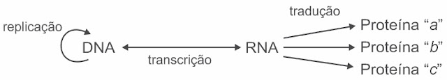 9 – (ENEM 2009) A figura seguinte representa um modelo de transmissão da informação genética nos sistemas biológicos. No fim do processo, que inclui a replicação, a transcrição e a tradução, há três formas proteicas diferentes denominadas a, b e c.