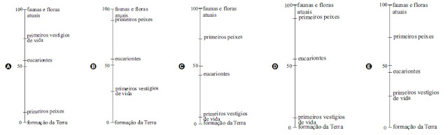 8 – (ENEM 2006) Entre as opções a seguir, assinale a que melhor representa a história da Terra em uma escala de 0 a 100, com comprimentos iguais para intervalos de tempo de mesma duração.