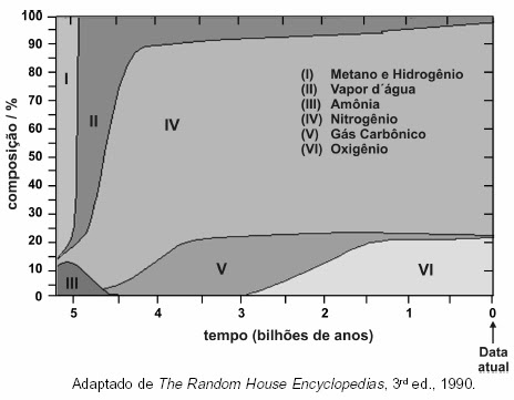 (ENEM 2002 – QUESTÕES 3 e 4) As áreas numeradas no gráfico mostram a composição em volume, aproximada, dos gases na atmosfera terrestre, desde a sua formação até os dias atuais.