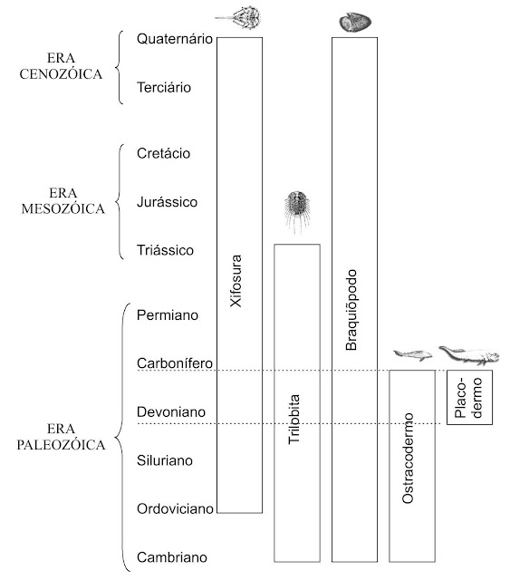 5 – (ENEM 2005) Uma expedição de paleontólogos descobre em um determinado extrato geológico marinho uma nova espécie de animal fossilizado. No mesmo extrato, foram encontrados artrópodes xifosuras e trilobitas, braquiópodos e peixes ostracodermos e placodermos.