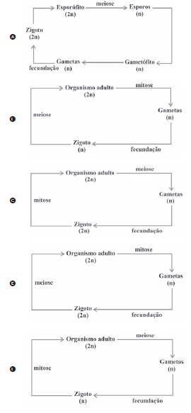 1 – (ENEM 2009) Os seres vivos apresentam diferentes ciclos de vida, caracterizados pelas fases nas quais gametas são produzidos e pelos processos reprodutivos que resultam na geração de novos indivíduos. Considerando-se um modelo simplificado padrão para geração de indivíduos viáveis, a alternativa que corresponde ao observado em seres humanos é: