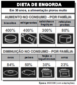 I. As famílias brasileiras, em 30 anos, aumentaram muito o consumo de proteínas e grãos, que, por seu alto valor calórico, não são recomendáveis.