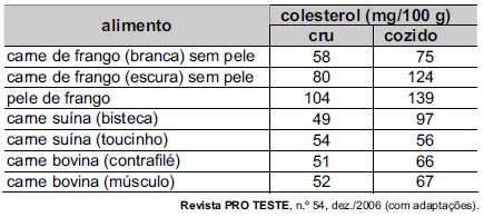O quadro abaixo apresenta a quantidade de colesterol em diversos tipos de carne crua e cozida.