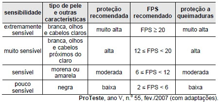A pele humana é sensível à radiação solar, e essa sensibilidade depende das características da pele. Os filtros solares são produtos que podem ser aplicados sobre a pele para protegê-la da radiação solar. A eficácia dos filtros solares é definida pelo fator de proteção solar (FPS), que indica quantas vezes o tempo de exposição ao sol, sem o risco de vermelhidão, pode ser aumentado com o uso do protetor solar. A tabela seguinte reúne informações encontradas em rótulos de filtros solares.